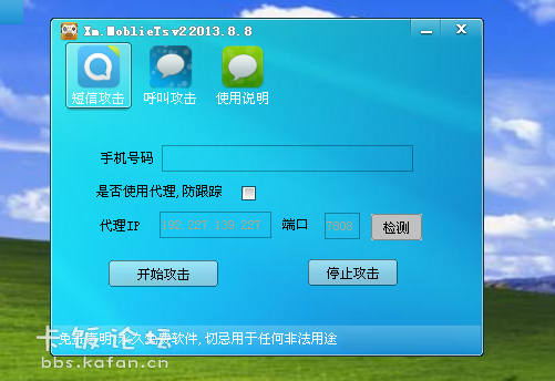 Xm.MoblieTs是一款手机短信攻击,手机呼叫攻击器,是整蛊朋友、对付垃圾短信、讨债、对付骗子的超强武器。几乎支持所有号码,平均每分钟N条短信N个电话(逆风行提供),火力十分强大,史无前例,让对方手机变振动棒。软件体积小,且安全绿色,便于携带,请勿用于非法用途,造成一切法律责任与本人无关。