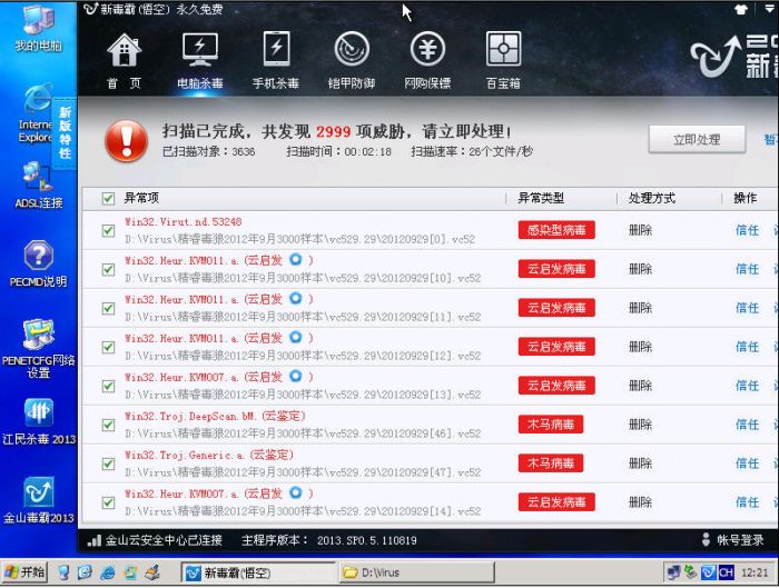 就开始着手对国外2013版杀毒软件进行测试并设法研制成PE版。ESET6.0早出来了,且已制作成绿色PE版了,但正式版还没发布,估计年底或2013才能问世,所以就把ESET6.0当作2013版吧。小红伞2013中文正式版也出来了,我也在PE系统中成功运行了。现在大蜘蛛8.0终于也出来了,但在制作成能在PE中运行的绿色版却碰到了难题,开始在Win7系统中安装都会出现蓝屏死机(可能与我系统安装过不少杀毒软件并没删除干净有关),没想到在PE系统中到不会蓝屏死机,但无法激活授权文件无法打开扫描程序。经过反复研究,原来是我用的测试KEY,是无法激活的。于是寻找到有效的KEY文件后居然能在PE系统中激活并打开扫描程序了。于是我的“国外2013杀毒软件PE光盘”也可推出来让大家测试了。